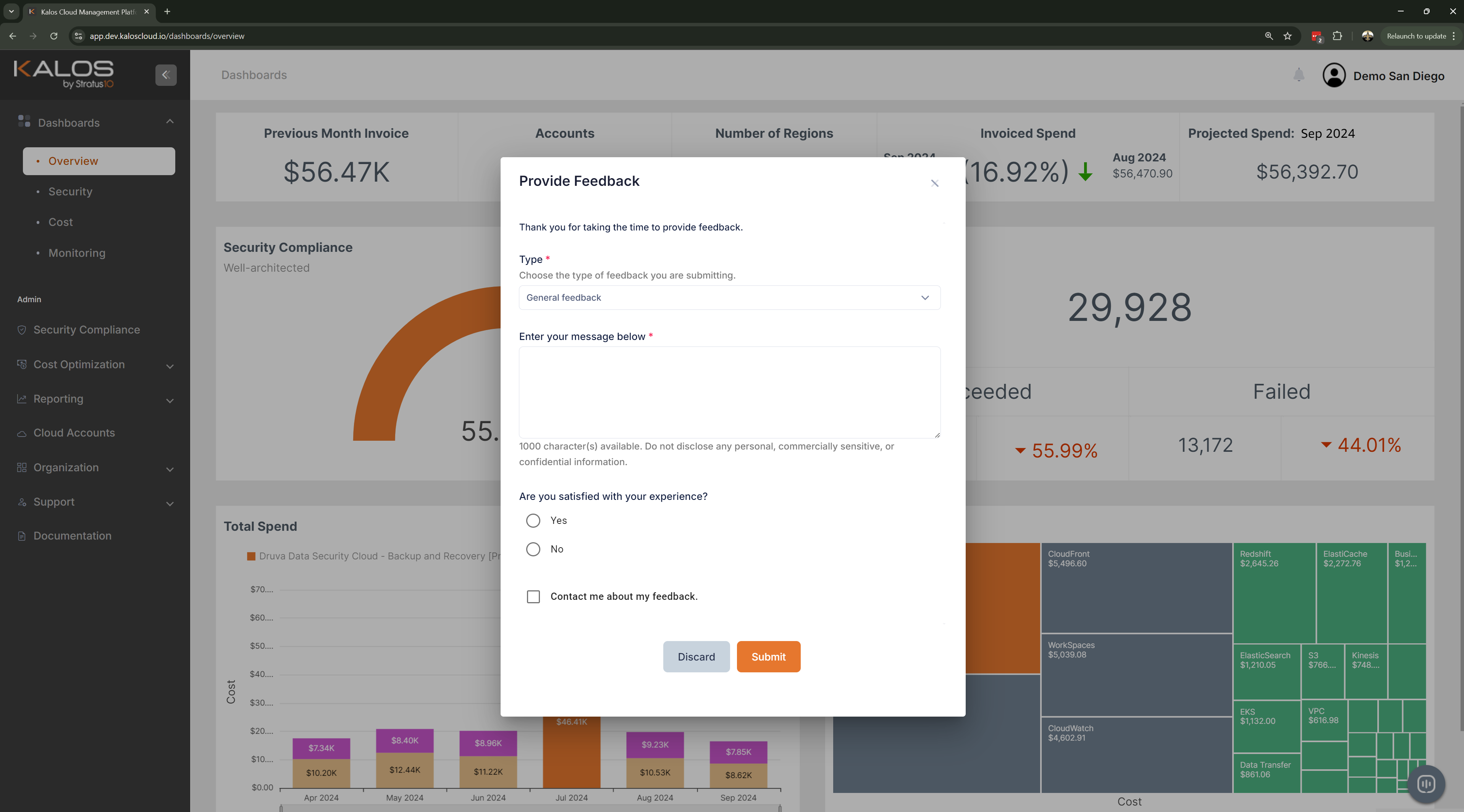 A feedback form will pop up for you to provide feedback on your experience with Kalos, request a specific feature, or any other items you think could be improved.